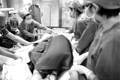 值班护士们正将一名刚下手术台的患者转移到病床上。