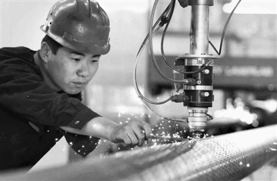 5月12日,河北省沧州市,在位于运河区激光产业园内的河北华工森茂特激光公司,工人在生产石油筛管。