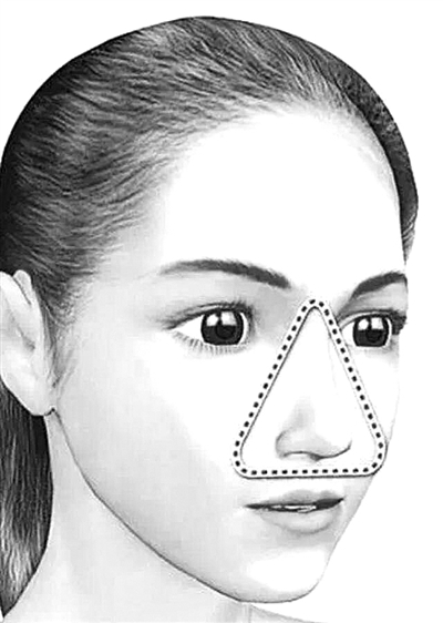 面部三角区是由鼻根与嘴角两侧连线构成的等腰三角形。如果三角区出现不对称,提示面瘫、脑梗死、脑出血。如果鼻梁上出现十字形或纵向皱纹,显示脊柱可能有疾病。人中区颜色暗绿,提示有胆囊炎、胆绞痛。面部三角区有丰富的静脉网与颅内相通。一旦损伤或感染细菌或病毒就可随血管回流到脑部,引起颅内感染,甚至危及生命。如果出现疖、痈,千万不能随意挑刺、挤压。否则,极易导致颅内感染。因此,又称危险三角区。