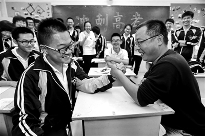 5月15日,衡水市第二中学高三学生(前左)与老师在课间玩掰手腕游戏。