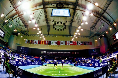 5月15日,2016年汤尤杯赛在江苏昆山市体育中心体育馆开赛。图为比赛现场。