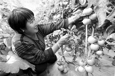 5月16日,河北省阳原县九马坊村一家农民专业合作社的菜农牛桂珍在西红柿大棚内忙碌。
