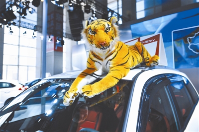 5月16日,山东省青岛市,第十五届青岛国际车展进入尾声,客流人数依旧保持高峰状态,销量持续“井喷”,一天有3800多辆新车卖出,平均每分钟有六辆汽车被订购。图为青岛国际车展奇瑞汽车公司的促销宝贝老虎模型。
