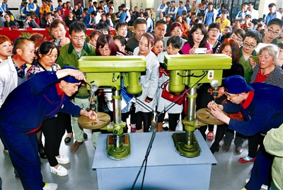 在平遥现代工程技术学校的“技能展示周”上,机械技术专业的学生用钻头在鸡蛋上“作画”(5月13日摄)。