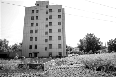 南京化工园区大厂街道蒋洼村一座七层办公楼,废弃的院子里种有蔬菜,其它地方长满杂草(5月10日摄)。