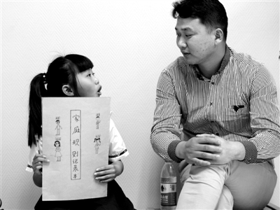 5月18日,浙江省金华市,于可欣拿着《家规》,每天都要跟家人逐条对照“讲评”,其中规定爸爸每晚玩手机不能超过1小时,弄得爸爸心服口服。