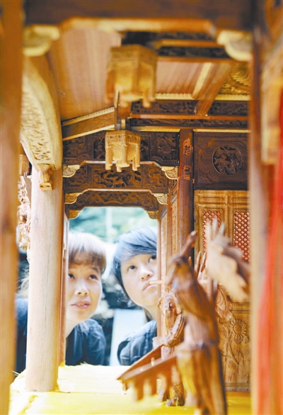 人们正仔细地观赏由古建筑修复公司雕制而成的“微型古戏台”。朱定文/视觉中国
