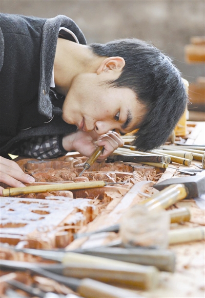 “90后”古戏台木雕技艺传承人正在认真手工雕刻图案。朱定文/视觉中国