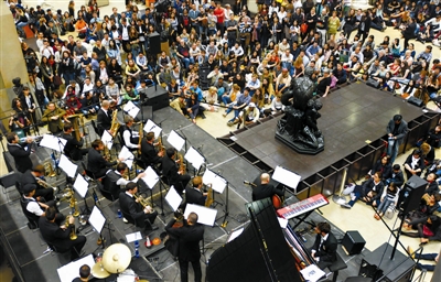 5月21日,在法国巴黎举行的“欧洲博物馆之夜”活动中,人们在奥赛博物馆欣赏爵士乐表演。