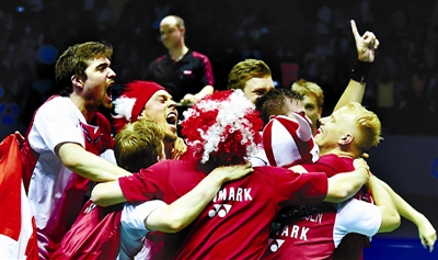 2016年5月22日,汤姆斯杯在昆山落下帷幕,丹麦队以3比2险胜印尼队,成为历史上首个捧起汤杯的欧洲国家。图为丹麦队队员庆祝夺冠。本报记者 许之丰 摄