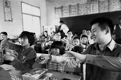 5月22日,安徽省阜阳市的党员志愿者当起临泉县吕寨镇张老庄小学贫困留守儿童的代理父母。活动期间,志愿者给贫困留守儿童送上了价值3万元的爱心书包、学习文具和文体设备。图为留守儿童和党员志愿者一起演练如何正确洗手。刘源 摄/东方IC