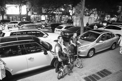 夜市经济也带动了相关产业的发展, 图为两名代驾司机在饭店门前等候接单。