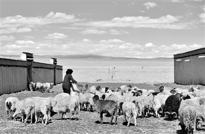 5月21日,工作人员在日喀则岗巴羊养殖专业合作社给羊喂食。