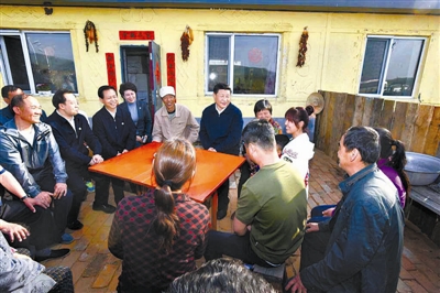 5月23日下午,习近平在伊春上甘岭林业局溪水经营所林场职工刘养顺(左五)家,同一家人及其邻居们亲切交谈。 新华社记者 李涛 摄