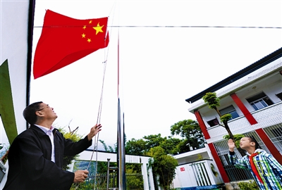 5月26日,吴志光老师和兰新荣在操场参加升国旗仪式。