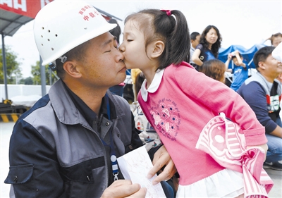 5月28日,一名小朋友为父亲送上自己的绘画作品并亲吻父亲。