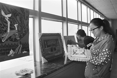 近日,乌鲁木齐铁路局库尔勒货运中心工会组织职工开展了手工艺术作品创作。图为职工们在参观优秀作品。 罗静 摄