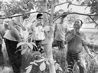 新疆生产建设兵团第一师三团鼓励规模种植养殖,扶持了一批种养大户。图为该团职工“核桃大王”柴团结义务为村民讲解核桃小树管理技术。刘朝江 摄