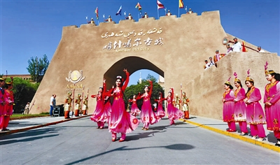 5月27日,在新疆喀什古城大门,身着民族盛装的姑娘们跳起舞蹈迎接宾客。