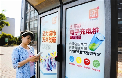 5月29日,张家口下花园区市民在使用太阳能充电桩为手机充电。