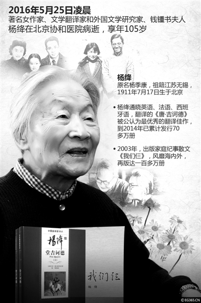 5月25日,著名作家、文学翻译家和外国文学研究家杨绛;钱锺书之妻、钱瑗之母杨绛;最才的女、最贤的妻杨绛,走完了她彩云琉璃与离散破碎的一生,圆了她“洗净这一百年沾染的污秽回家”的心愿。