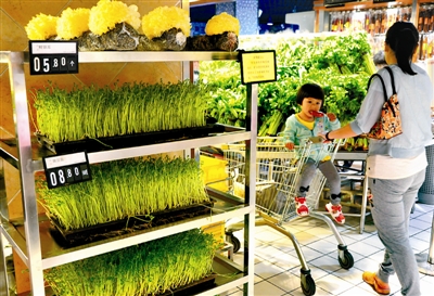 5月30日,河南许昌市区某超市,“活体蔬菜”豌豆苗、银耳亮相,吸引人们的眼球。随着人们对健康的要求越来越高,一些商家开始大打“健康牌”,推广售卖新鲜的“活体蔬菜”,成为超市的一道风景。 牛志勇 摄/中新社