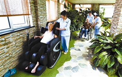5月31日,老人在八里庄老年养护院的休闲空间赏花和接受按摩。