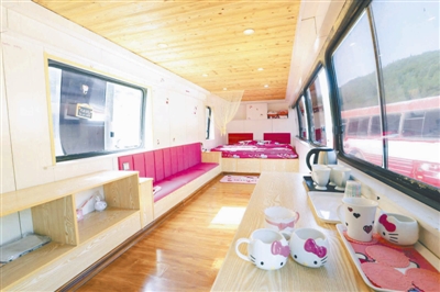 5月29日,山西省太原市,某景区回收数十辆废旧公交车并按照国际化标准打造出不同风格主题房车。车内厨具、电视、空调、洗浴、卫生间等设施齐备,以最低每日不足200元人民币向外出租,以低价吸引青年前来享受野外露营项目。