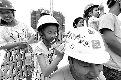 当天,儿女们在爸爸的安全帽上画上笑脸,书写祝语,让笑脸陪伴着爸爸一起工作,也时刻提醒他们安全第一。