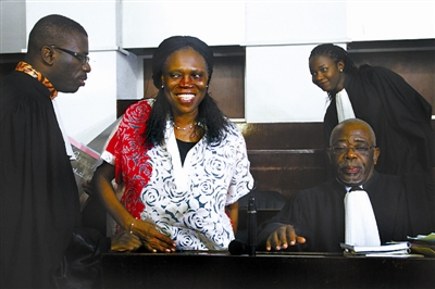 5月31日,在科特迪瓦经济首都阿比让, 科特迪瓦前总统巴博的妻子西蒙娜·巴博(左二)出庭受审。西蒙娜被指控在科总统选举后的政治危机时期,犯有“反人类罪”“反战俘罪”和“反平民罪”。 新华社发(伊万摄)