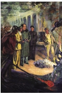 再如侯一民先生创作于1960年的《刘少奇与安源矿工》,该画描绘的是刘少奇号召安源矿工大罢工的历史事件,在回顾革命事件的同时,还展现了工人阶级的力量。