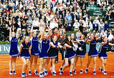 图为2016年6月5日,焦科维奇(后排中)夺冠后与球童一道向观众致意。新华社发
