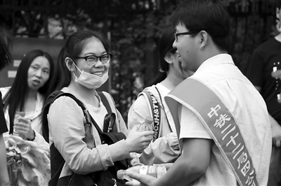 6月7日,2016年全国高考拉开序幕。驻地在天津武清的中国铁建二十二局集团四公司爱心助考团小分队,当天一大早就冒着小雨,带着矿泉水和对考生、家长的关爱,来到考场前,给他们送去温馨的祝福,为考生解压。本报通讯员 武新才 赵忠航 摄