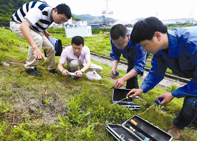 6月7日,在浙江省宁波市北仑区新碶街道岙涨水库背水坡上,白蚁防治人员和水库管理人员在排查白蚁分飞点。