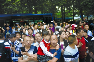 图1:6月7日下午,在贵阳市师大附中考场外,一位戴着红领巾的小姑娘龙婷朵搂着爸爸的脖子,四处寻找参加高考的姐姐。