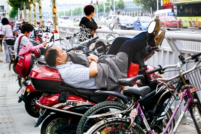 图2:6月7日,郑州。这位躺在电动车上的男士是一位考生家长。他说,自己平时睡觉爱打鼾,担心影响孩子休息,高考前一天的晚上就没咋睡。高考当天早上他叫孩子起床后,又送孩子到考场,这会儿孩子在里面考试,他就在电动车上眯会儿。
