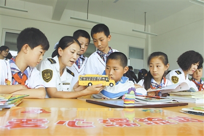 近日,山东省即墨温馨校车的工作人员陆续把社会爱心人士捐助的学习用品以及手工制作的校车模型送到乡村小学。图为6月6日,即墨市田横镇玉皇山小学的教室里,照顾员董极苹为孩子讲解乘车安全知识。