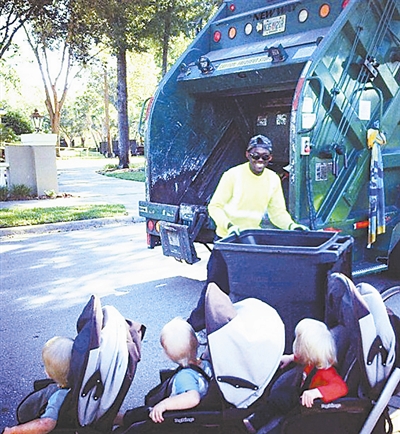 据外媒近日报道,美国佛罗里达州2岁的三胞胎女孩从小就和3名环卫工人成了好朋友。2年来,每周二和周五,三胞胎都会在路边等待环卫工的到来,和他们一起玩耍。