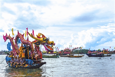6月9日,海南儋州光村镇泊潮村,人潮舞动。一场独特的渔家端午龙舟节正在古村上演。