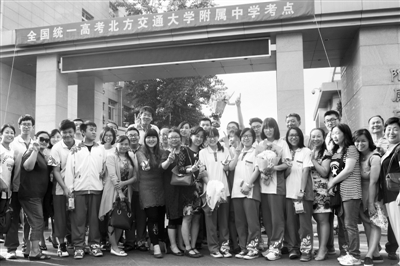 考试结束后 , 冯时与同学 、 老师 、 家长在考点外合影留念 。