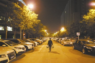 ←4月27日午夜过后,韩立群拿着啤酒和宵夜走向办公室。