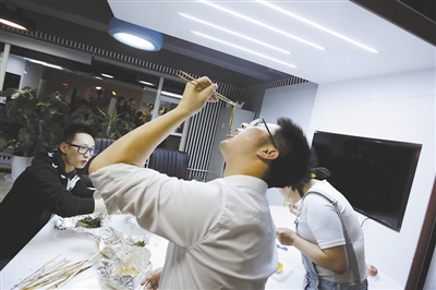 4月19日深夜,一家科技公司的员工在工作间隙吃宵夜。
