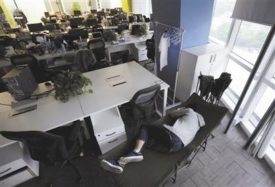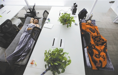 40岁的北京人代翔起初是一名工程师。转行从事科技行业的15年里,他在桌子或其他地方断断续续睡觉度过了很多深夜。去年代翔创立自己的云计算公司后,首先做的事情就是在办公室角落装了12张双层床。代翔说:“对于科技,更多用的是大脑,员工需要时间找到灵感。我们的休息区不只是晚上休息的地方,中午也可以。”