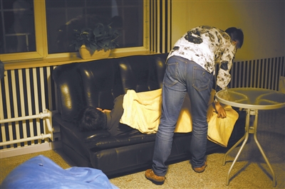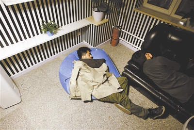 4月27日清晨,北京人人信用管理公司人事经理韩立群和向诗阳完成工作后在办公室行军床上睡觉。