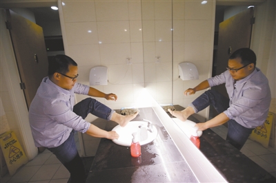 4月20日凌晨,刘占禹完成工作后在公司卫生间洗漱。