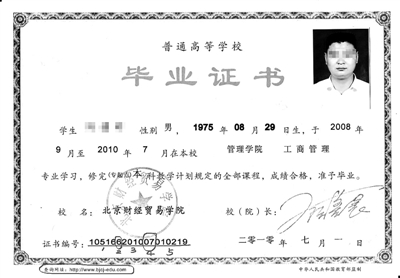 2013年,一位江苏昆山的网友周先生提供了2010年从该校获得的毕业证书,请求“上大学网”进行鉴定。根据学校名称和所在地,网站工作人员接连查询了国家教育部2008年至2013年期间公布的《具有普通高等学历教育招生资格的高等学校名单》,以及北京市教委在这几年间公布的民办高等教育机构文件,均未见到该校的踪影。至此,这所校名与正规高校“北京财贸职业学院”十分接近的学校已显得十分可疑。