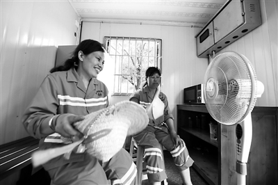 6月13日,两名环卫工人在环卫爱心驿站内休息。