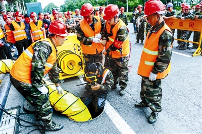 6月13日,一名抢险人员准备下井进行排险演习。