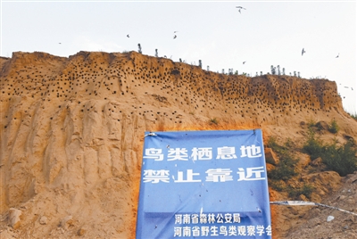 6月13日傍晚,郑州新郑市薛店镇南郊外一处取土工地,10000多平方米的施工工作区南北两侧的沙质崖壁上布满鸟洞。