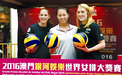当日,中国女排队员游览澳门名胜大三巴牌坊,并到板樟堂前地的赛事摊位进行宣传,沿途受到市民及游客欢迎。新华社记者 卢炳辉 摄